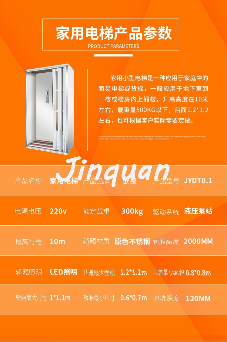 家用電梯采用液壓傳動,所以運行非常平穩。其液壓系統攜帶防爆閥,故障時可控制下降速度;另外,采用高強度鏈條牽引電梯上下,另附加鋼絲繩防止墜落,從而保證電梯的安全運行。