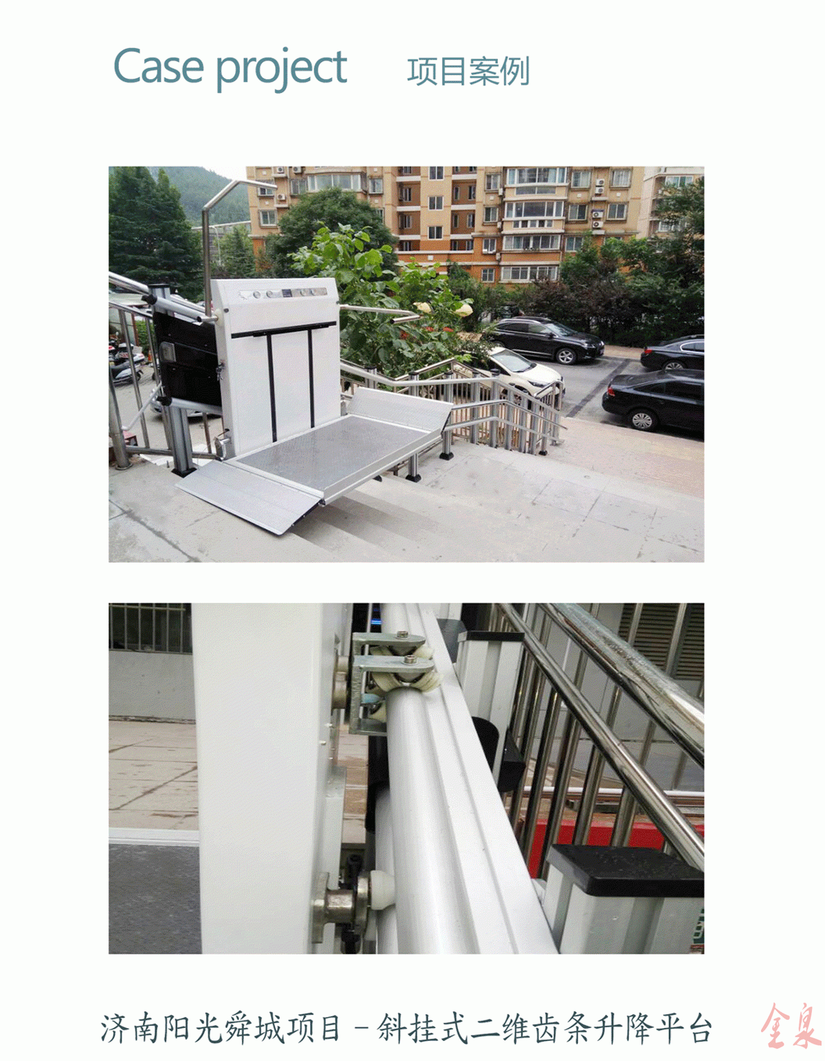 傾斜式無障礙升降平臺可安裝在室內和室外,可安裝在大型公共場所,如療養院,學校,餐廳,酒店,機場,地鐵,商場等。我們的斜掛式無障礙升降機平臺使用根據樓梯形狀設計的高精度導軌,可應用于直線,弧形,螺旋形樓梯。